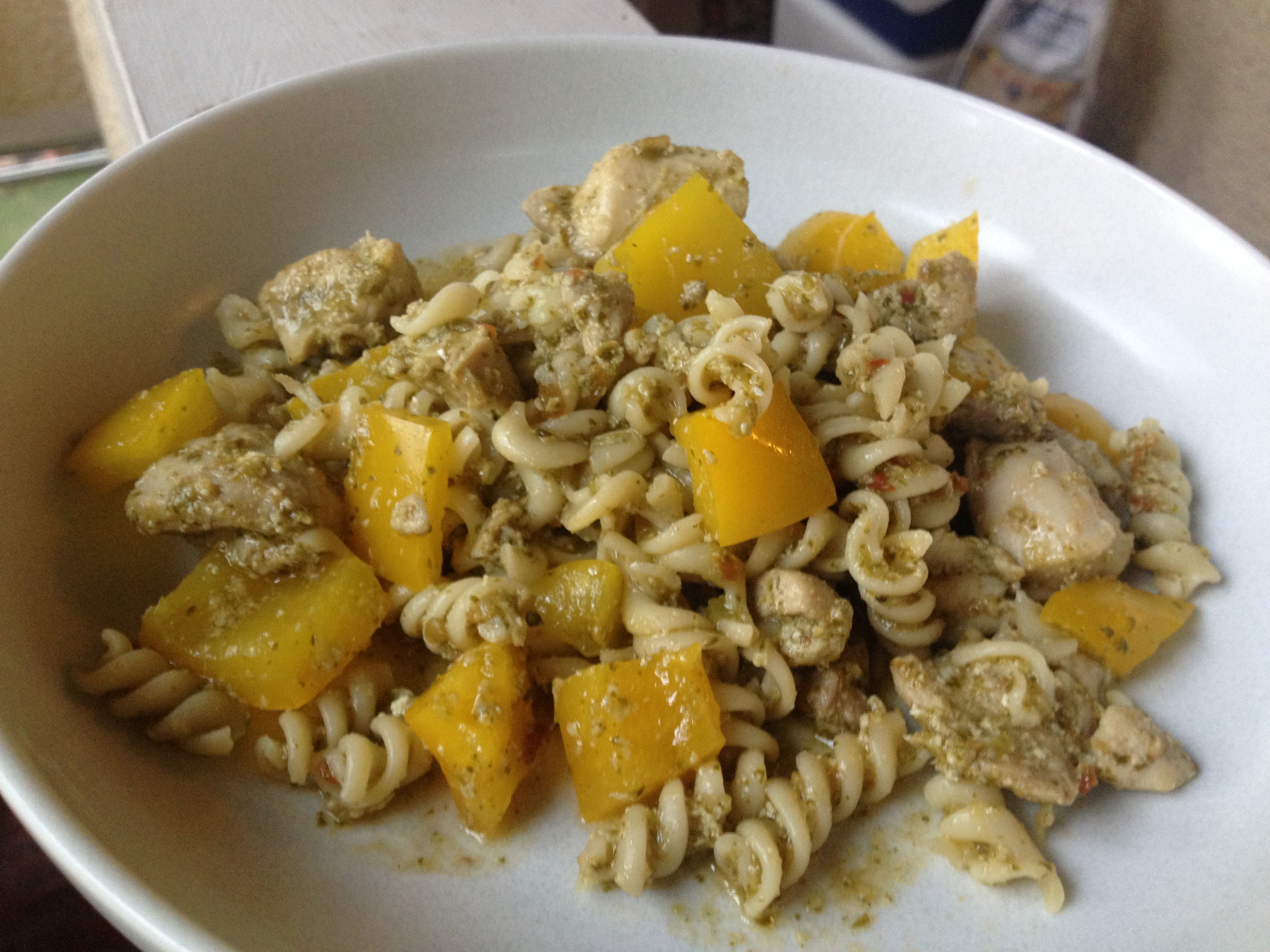 The next day I fried up the chicken in it’s ginger goo, then added the cilantro sauce. While that bubbled away I chopped the bell pepper. I was impatient and added the pepper and yogurt. I had a little more than a cup left in the container and just used it all up.