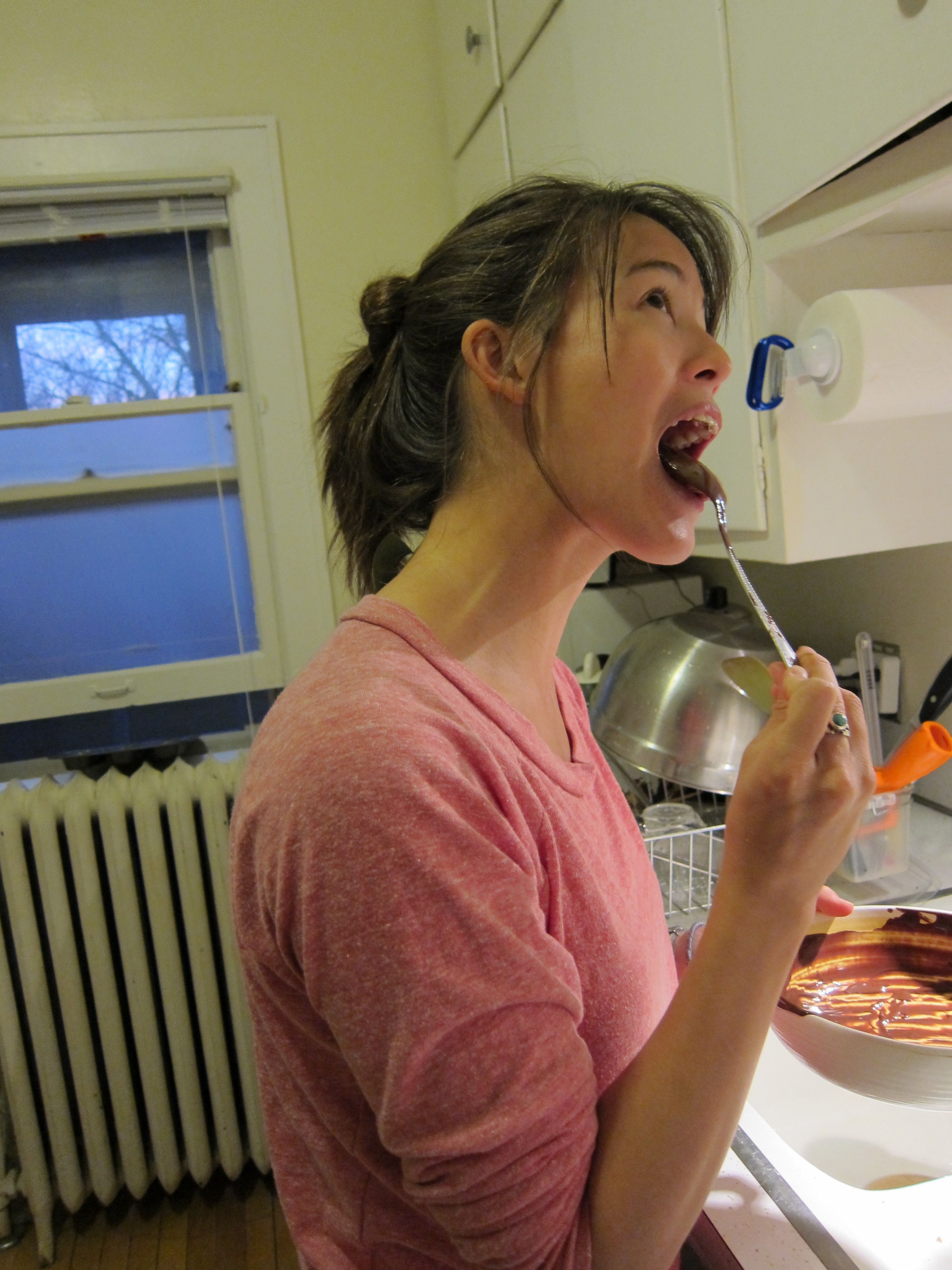 It was quite a bit darker until the milk and eggs went in. The white bits are not quite melted cream cheese.