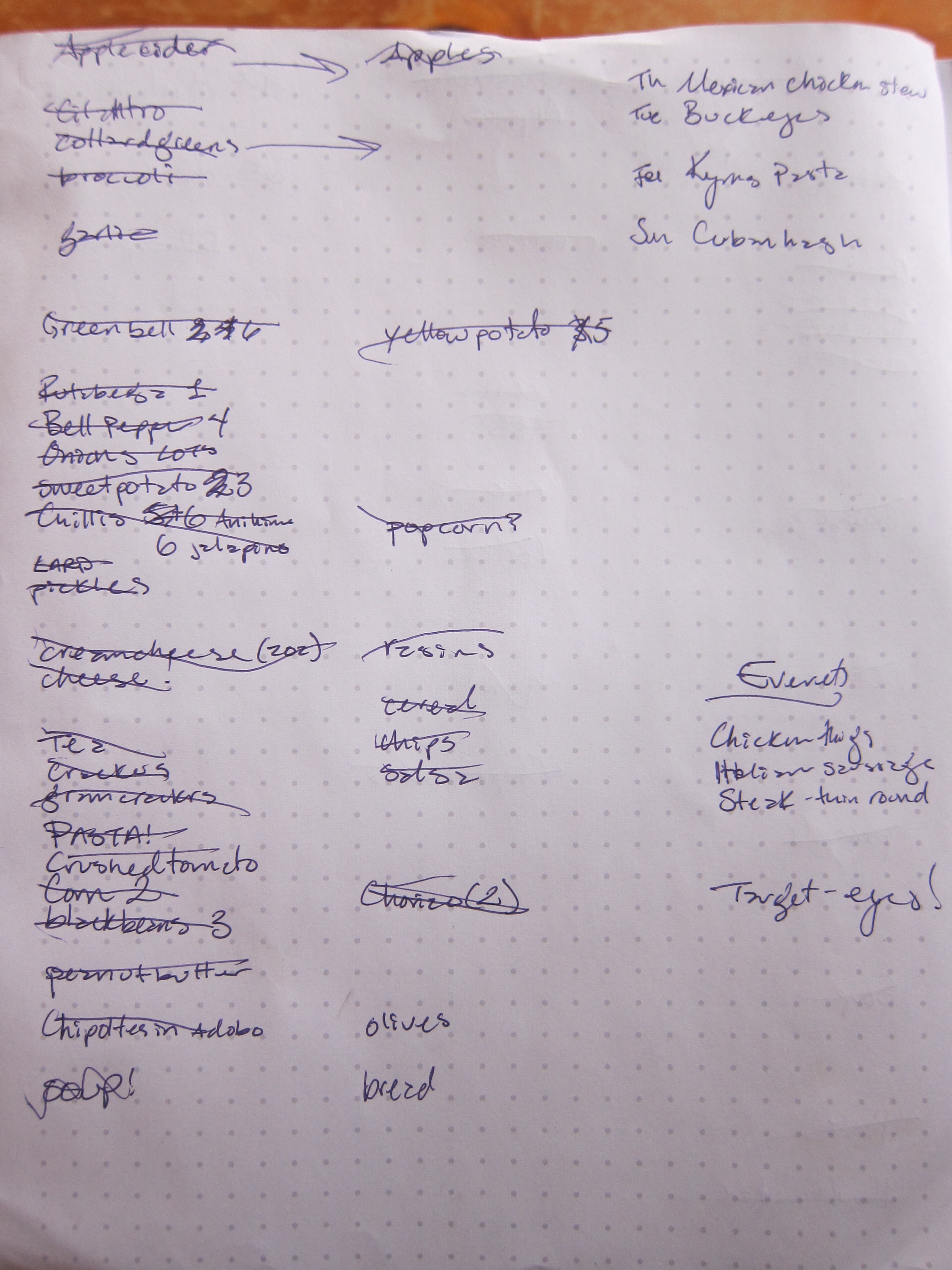 Left column is the Cub Food list. Middle column is Co-op list. Right column starts with the week’s menu, below that are the other errands, Everett’s and Target