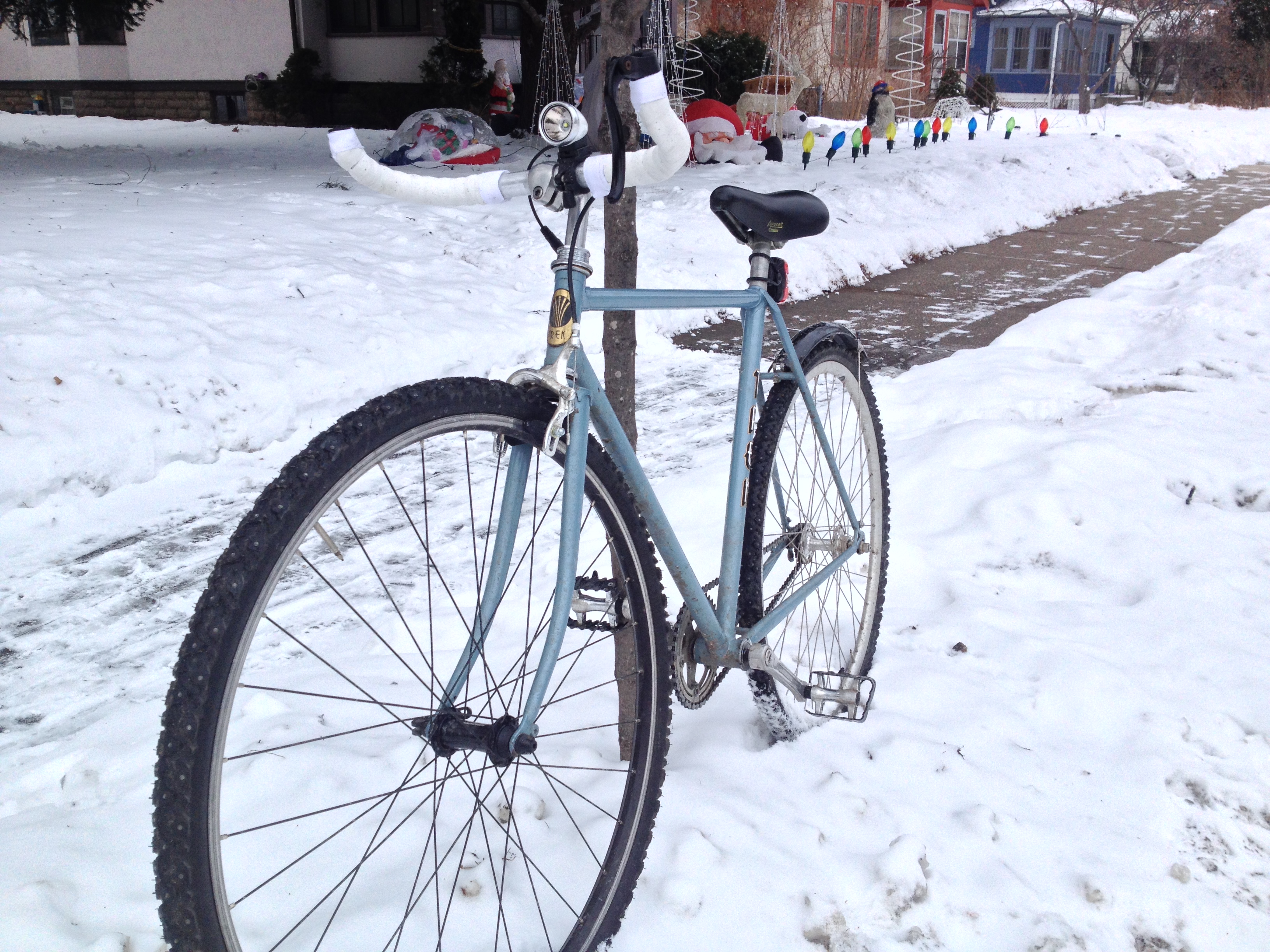 I need to buy some snow/ studded tires, after three wipeouts in one evening I haven’t ridden my bike for about three weeks. The cold doesn’t bother me, I can easily layer up, but the snow/ ice packed roads have psyched me out. Love your “new” bike! I have an old trek road bike that is my summer riding bike and it is by far my favorite. My autumn- spring bike is a newer Trex FX hybrid.