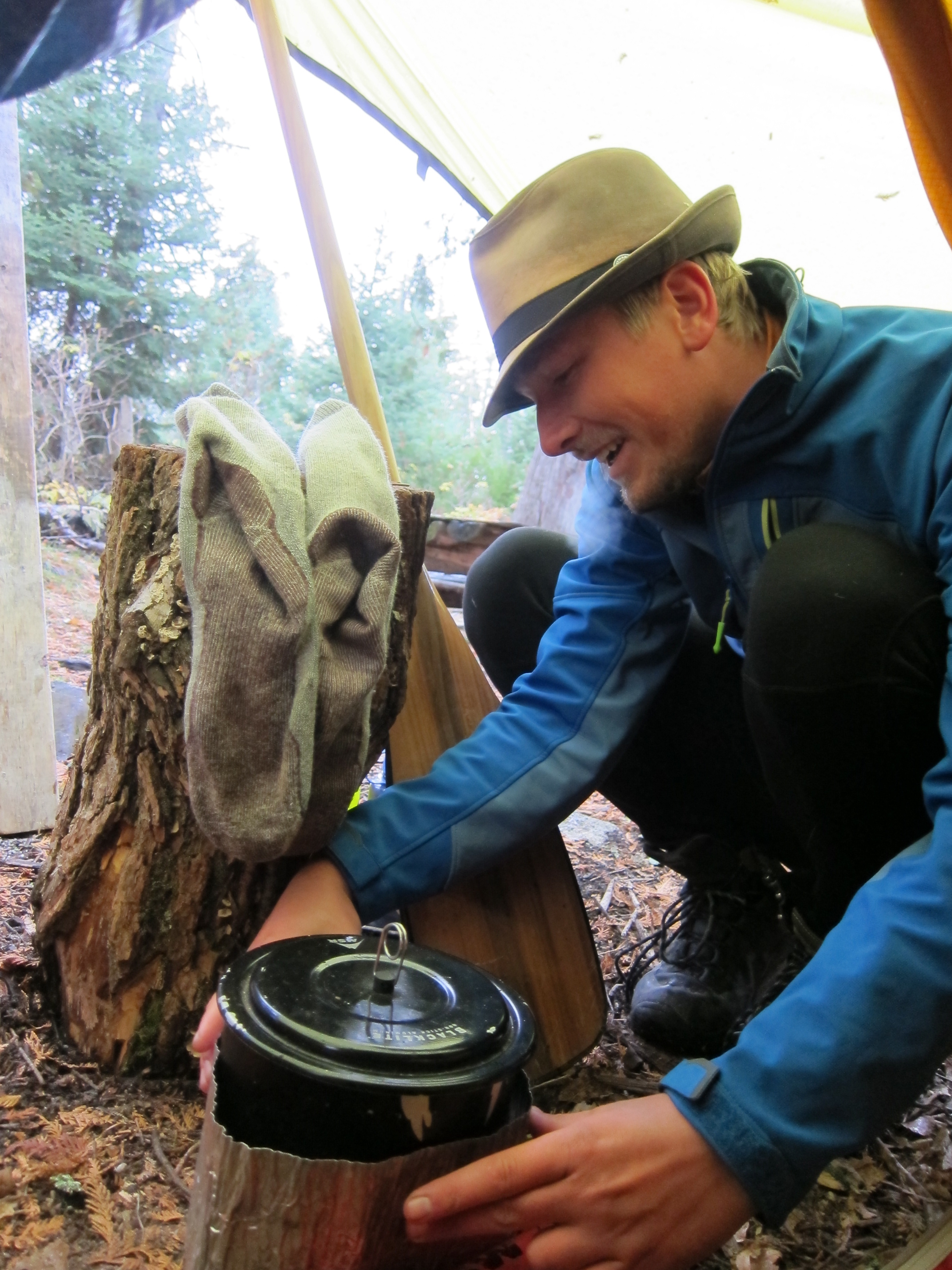 The campsite was on high ground surrounded by large and lush pines in the center of the tiny island. It was perfectly protected from the wind and wet. We set up just in time for the storm to kick up again. The weather continued into the next day. We stayed for a healing layover.