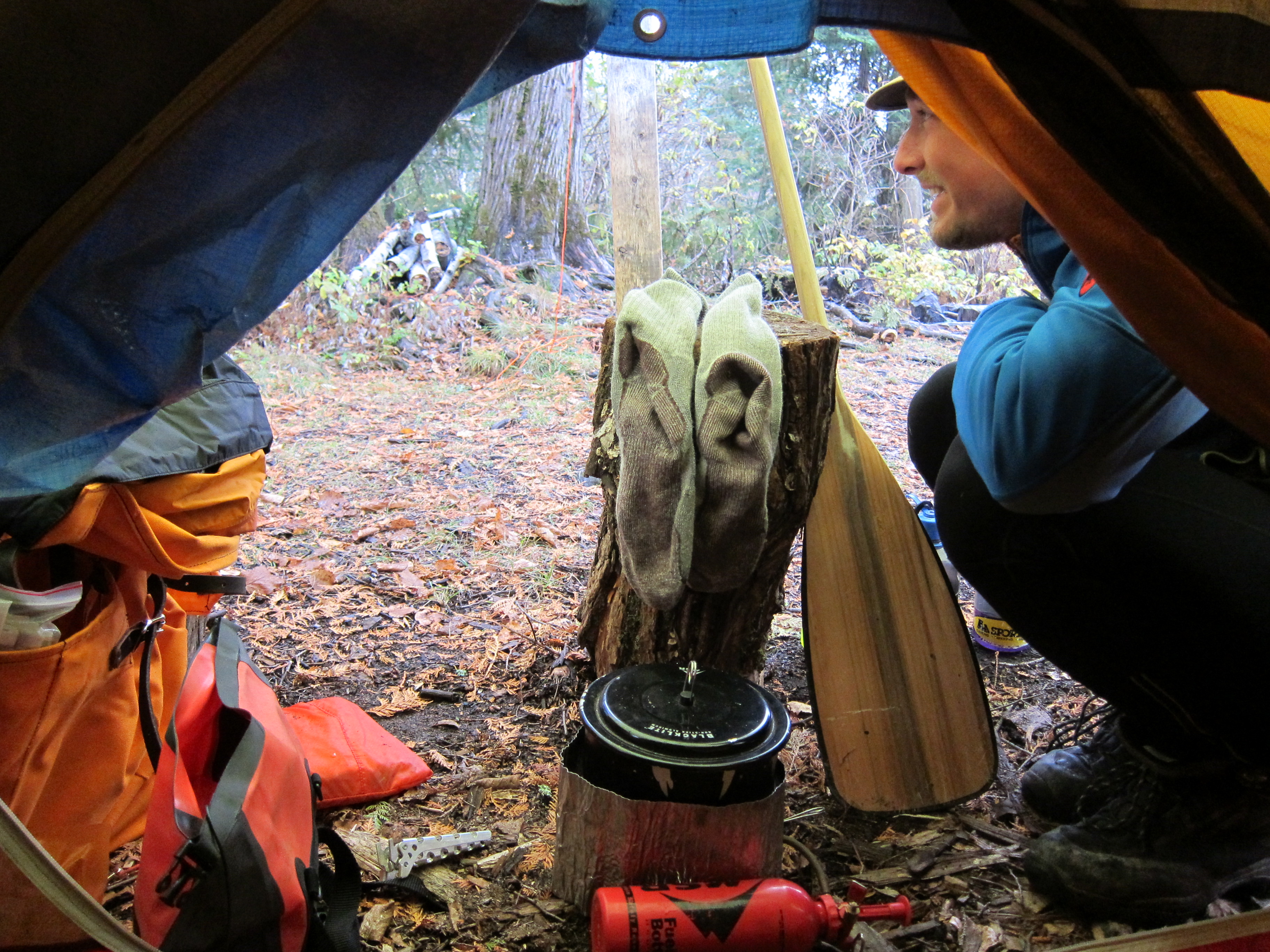 I felt the pressure of navigating as the conditions felt increasingly precarious. Was that an island or peninsula? Should we aim for the shorter windier route or the longer hopefully protected route? Towards the end I snapped and just broke down sobbing. Will could tell from my shaking shoulders that I was upset. I just wanted to keep paddling to shore. Will landed us on a tiny island and pulled me out of the boat for a hug break. We stood hugging in the freezing drizzle. Despite it being fairly early Will decided we were done for the day.
