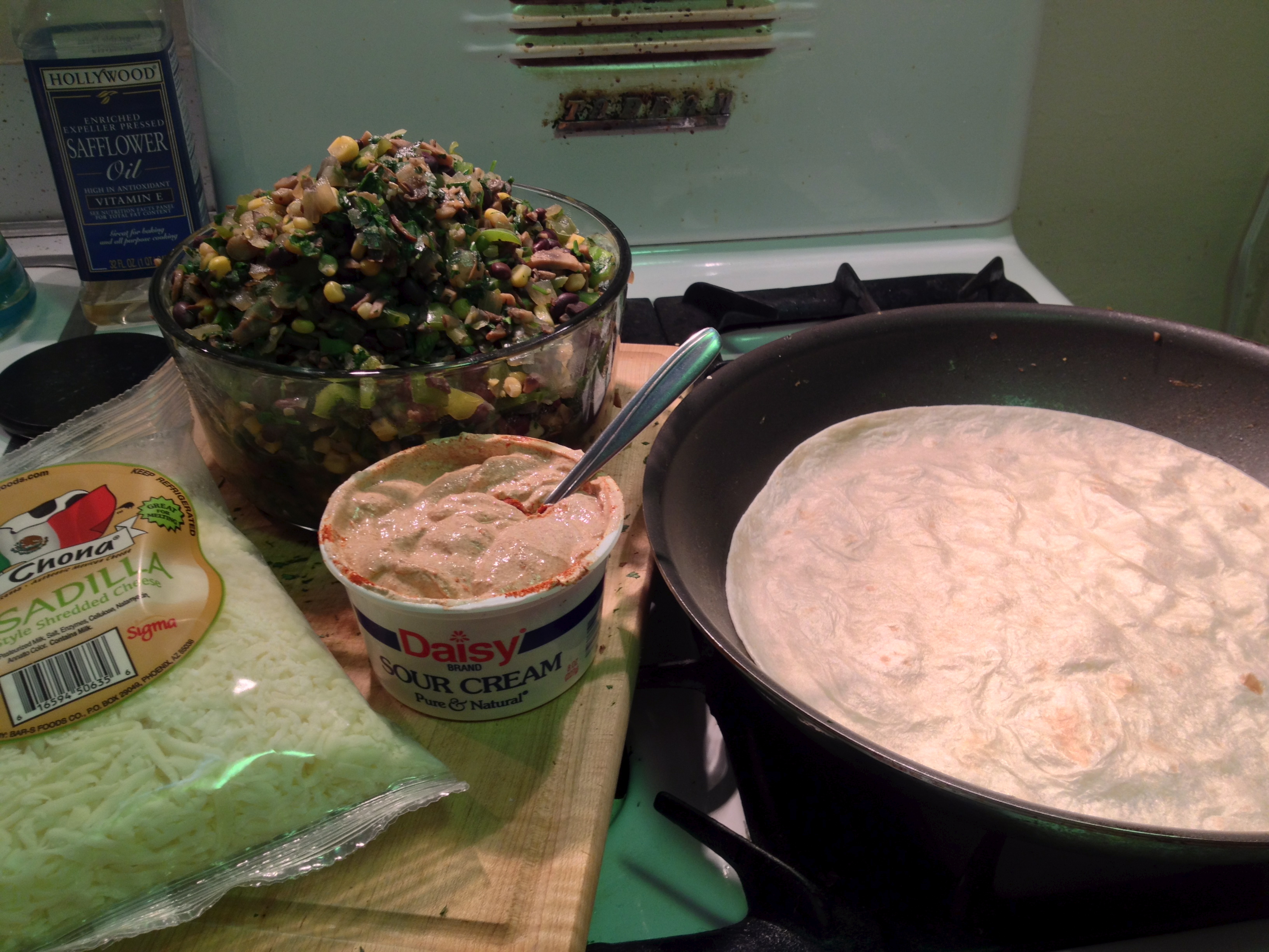 Quesadillas were up next. I started making these years ago when Will was craving Taco Bell. I think my vegetarian ones are way better.