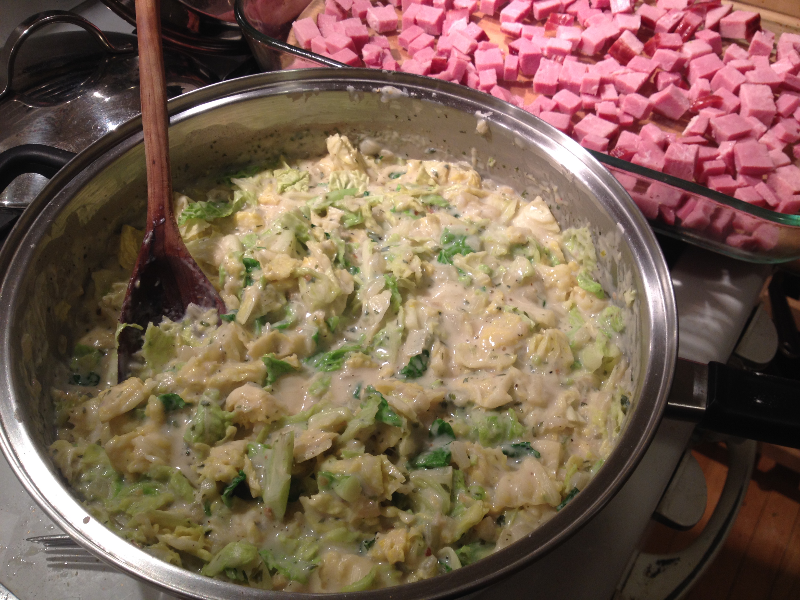 While the cabbage was getting tender. Will mashed the potatoes and I diced ham.
