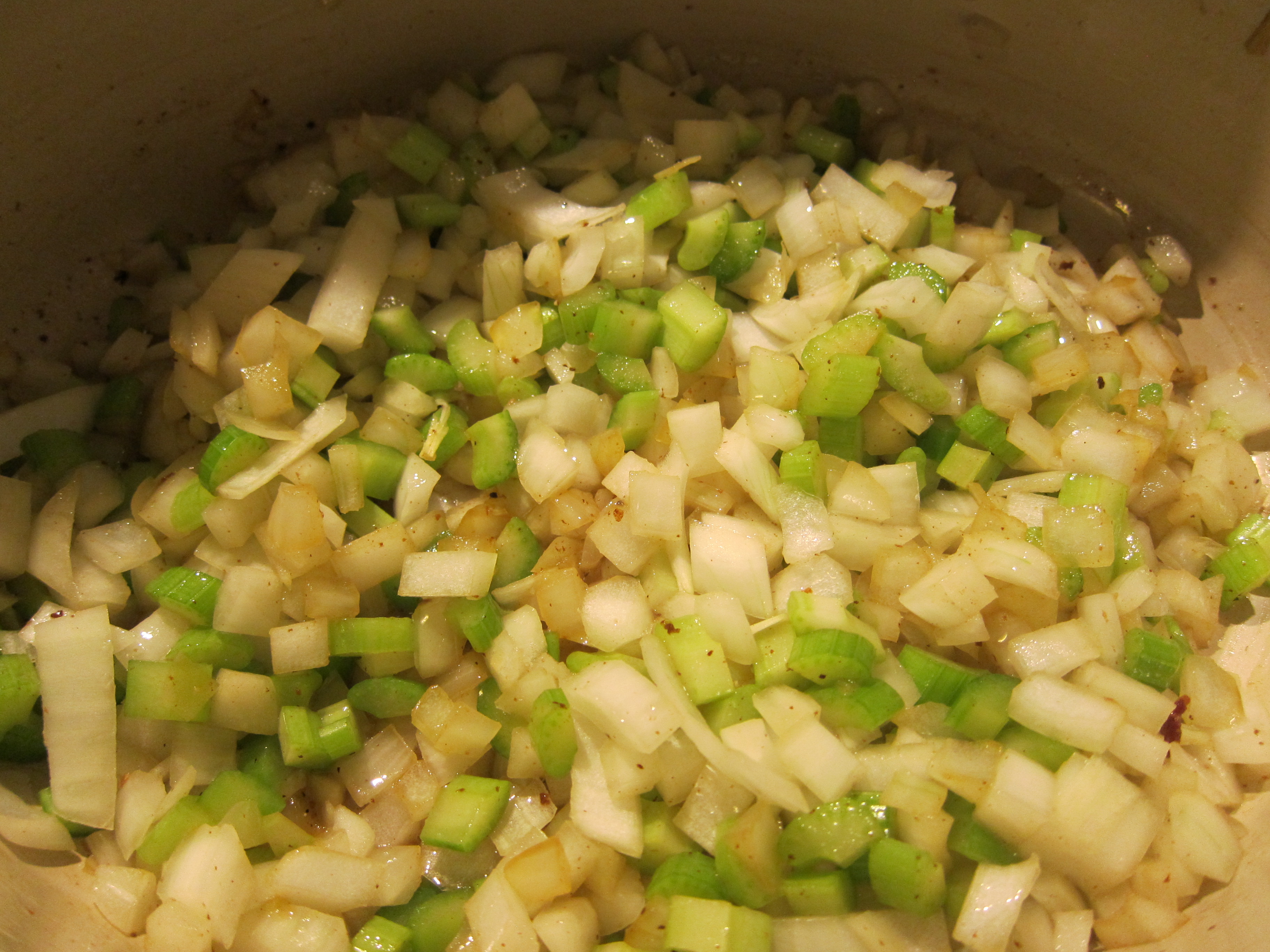 – 1 onion, 3 stalks celery, 4ish cloves garlic, chopped fine and tossed to sweat in the oil.