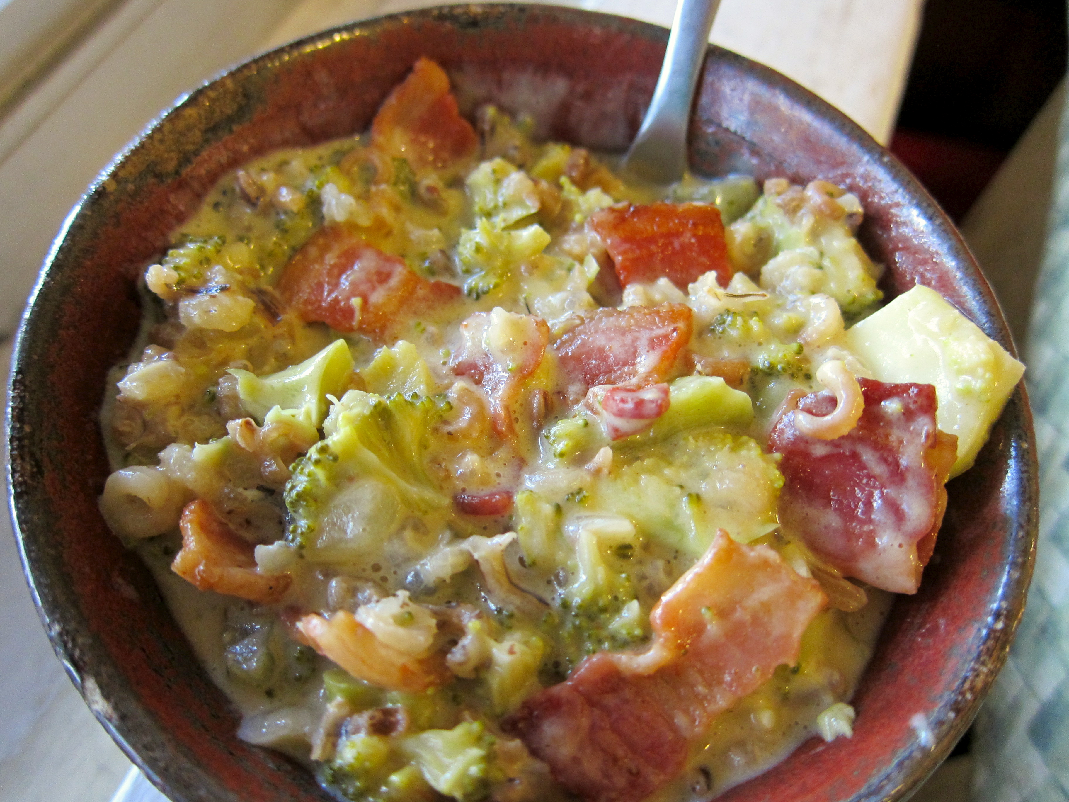 I wanted terribly fatty thick rich soup. Bacon Beer Cheese soup. But if I cooked that I’d have to atone with ten zillion salads or something, which would really nullify the coziness of the soup. So I added a ton of broccoli and wild rice. All better right?