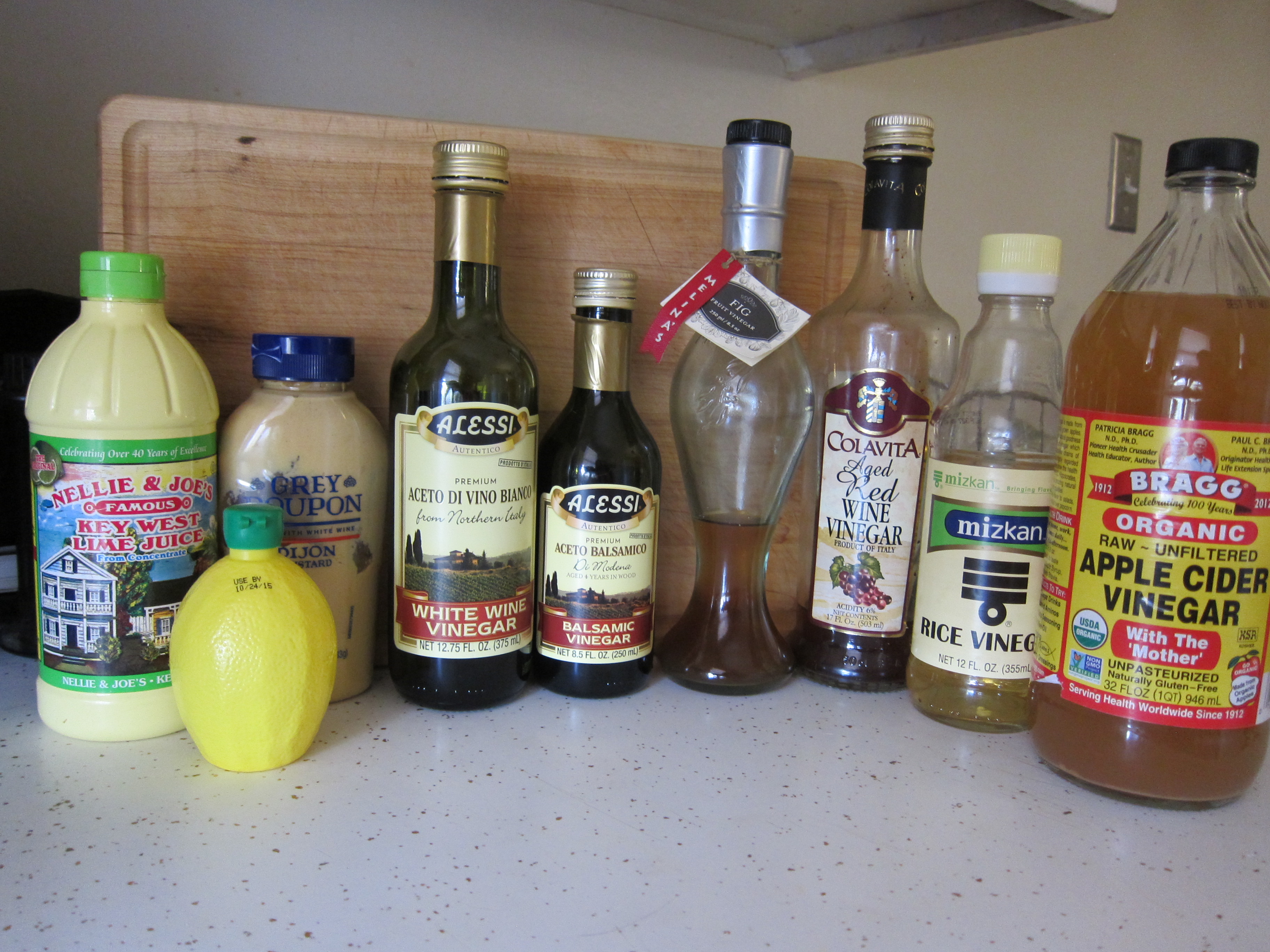Lemon and lime juice are the obvious choices. Grey Poupon is mostly white vinegar. I love vinegars. White, balsamic, fig, red, rice, apple cider vinegar is used enough to buy the big bottle.