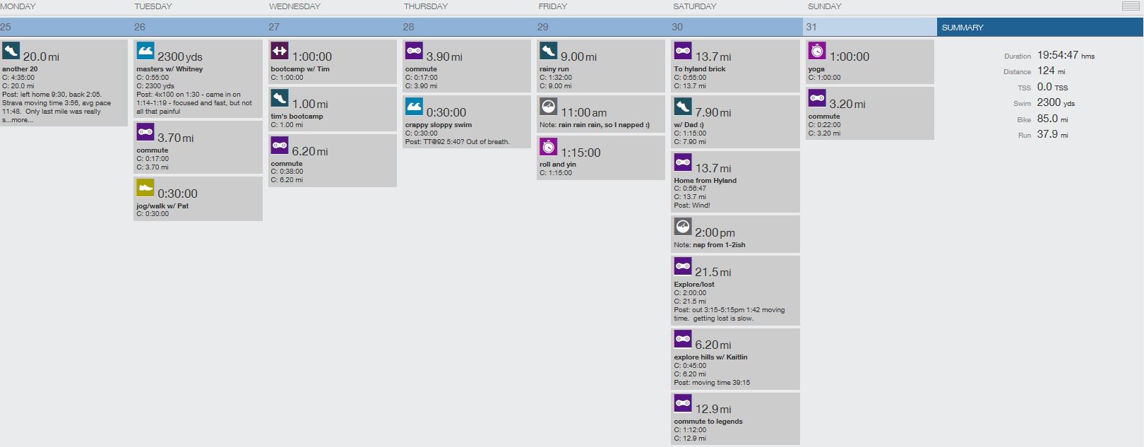4 weeks ago I was recovering from really miserable F*n training.  I spent that week doing almost nothing.  Lots of rolling around on tennis balls to massage my achy muscles.  One run, two bike rides.  That’s it.
