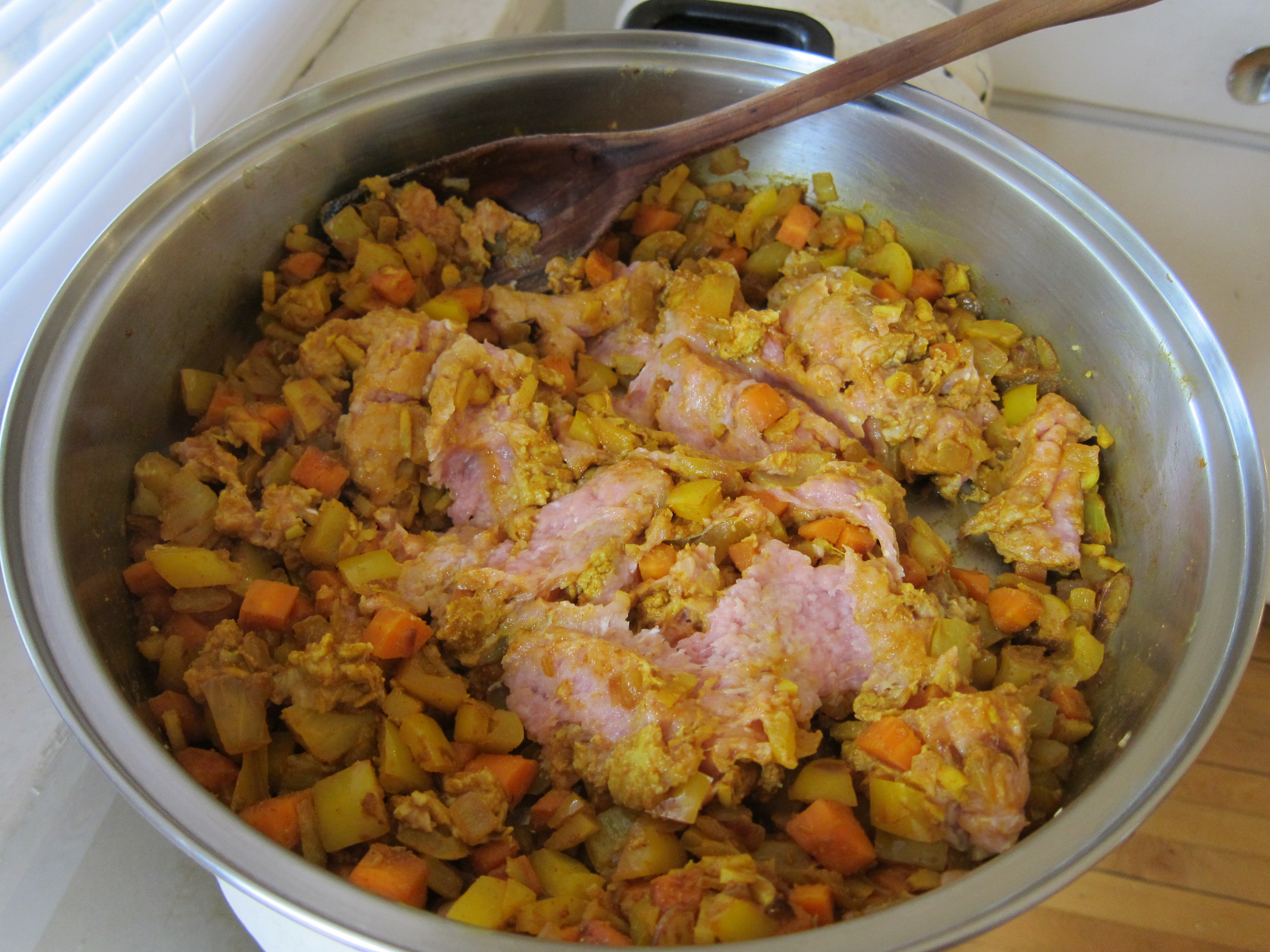 I bring you my versatile curry. I used ground chicken, because it was in the freezer, but this could easily be a vegetarian dish. Actually most things were already in my freezer or pantry. Perhaps you can use it a littlespring board for you own cooking imagination.