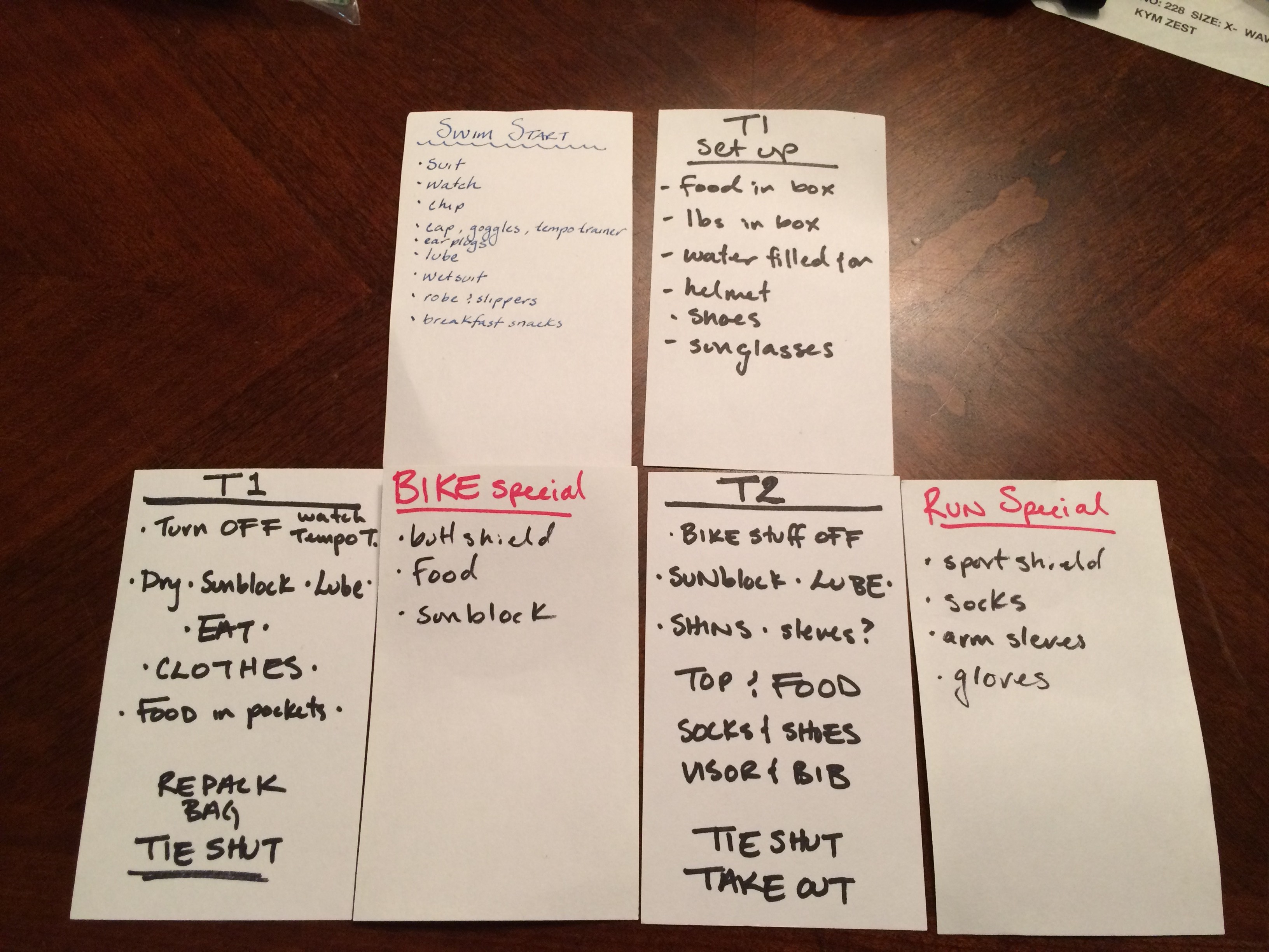 Cue cards so I know what should be in each bag and what to do with the stuff.