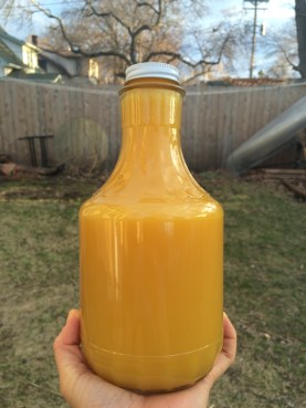 Straining it was quite the feat. I tried several things before it worked. It’ll go better next time. My mix was so fine I had to squeeze out the liquid from the veggies. I then mixed in honey until it tasted sweet enough for my liking (which I completely failed to measure).