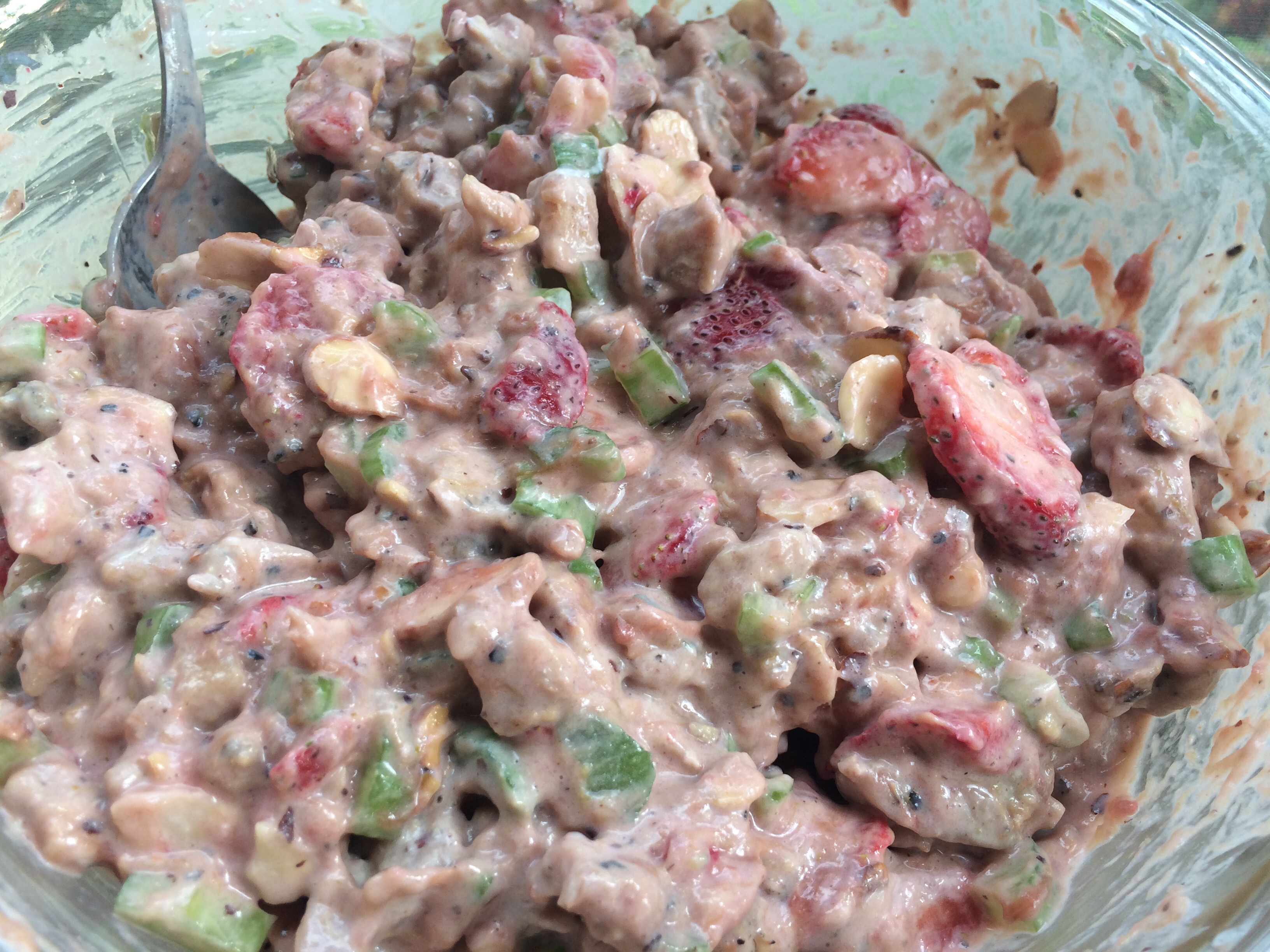 Then I mixed the yogurt salad stuff with the chicken. I added enough rhubarb jam for it to look like crap and taste delicious.