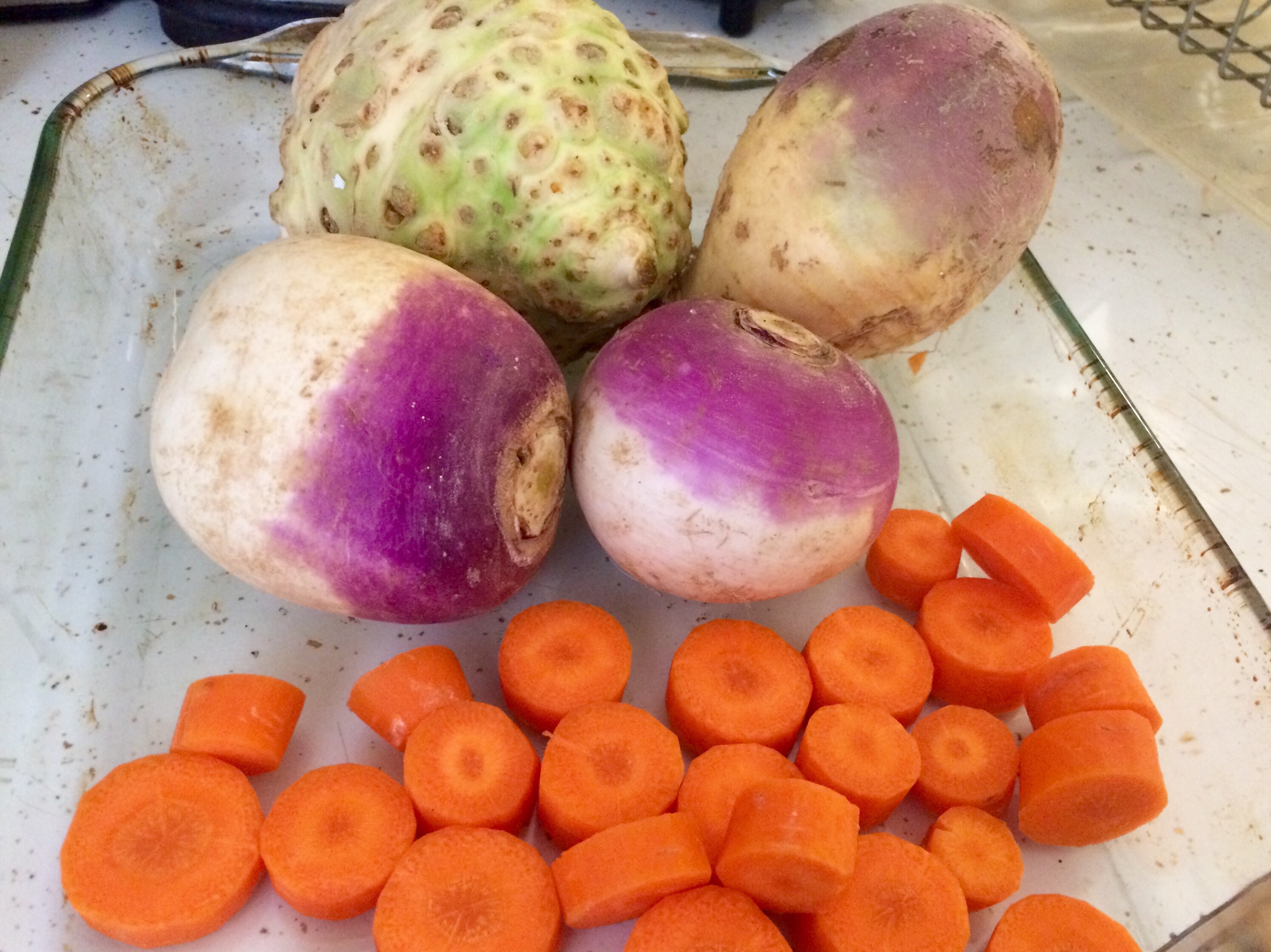 But the co-op was out of parsnips. Google to the rescue. Instead I got turnips, celeriac, and carrots. Also a rutabaga because Will loves them.