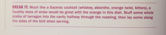 It still turned out heavenly. Unbelievably aromatic. The warm slightly caramelized oranges rounds still had enough juice in them to give a fresh squeeze over everything. The tarragon and roasted roots were the perfect paring with the chicken.