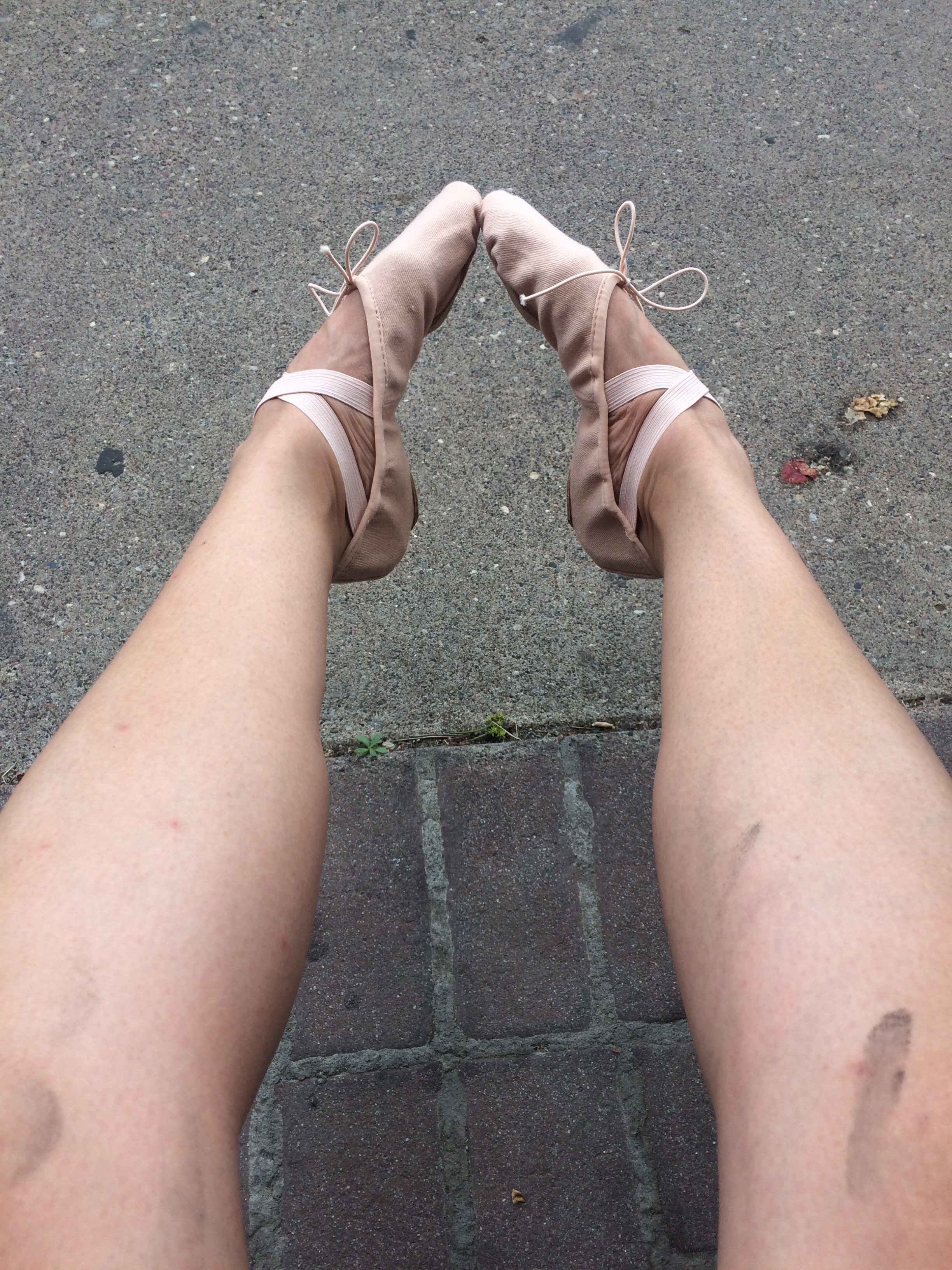 After trying a hip hop class and observing one ballet class I signed up. Immediately I biked way way out of my way to arrive at a dance supply store, dirty and drenched in sweat. The teenage employee was surprisingly gracious and helpful. I was so excited to have new “sport gear” that I walked out of the store and had to put on my brand new ballet slippers.