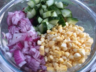 Chopped english cucumber, red onion, fresh raw corn cut off the cob (and my god this was better than anything canned or frozen). Sprinkled with generously with salt, about 1/2t of sugar, and a dousing of white wine vinegar. Mixed and let sit in the fridge, giving it a toss every now and then.