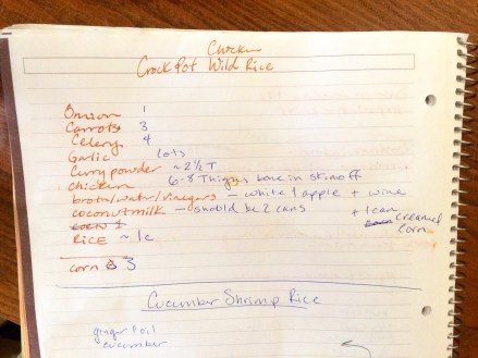 Here is proof of the non-recipe nature of this stew. This is the notebook I use to plan what to cook. It’s what I use to help assemble a grocery list and then assemble the ingredients for cooking. It’s clearly not an exact science.