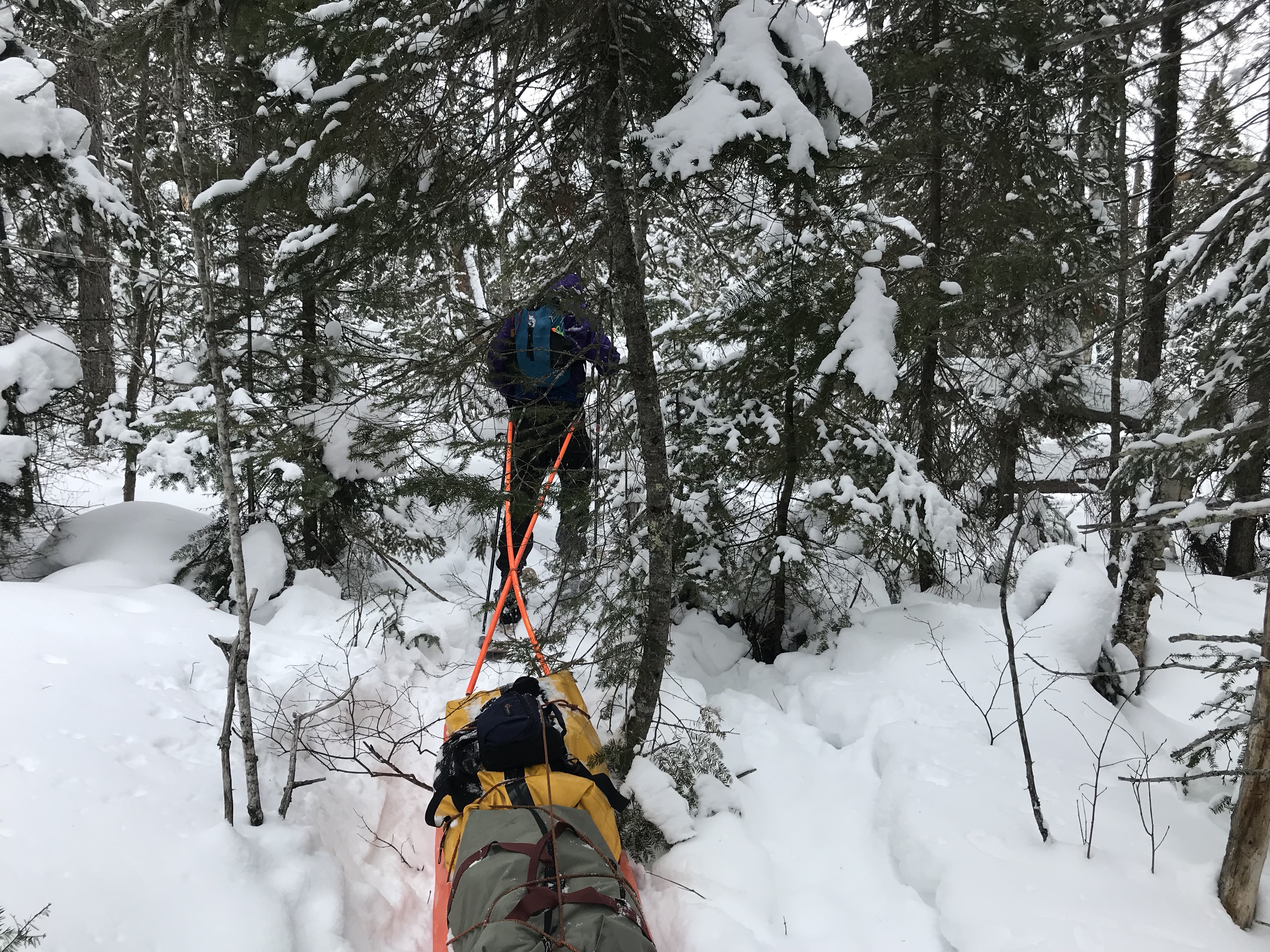 “We’ll drop the pulks at the last place we broke ground. Then you’ll break trail, but stay within sight of our pulks. Then we’ll go get the pulks and I’ll lead, giving you a rest. We’ll just inchworm our way through. If we get through, we have to start the next portage no later than 1pm to have a chance to make it through before dark so we don’t have to make camp on the portage like we did with Angleworm.”