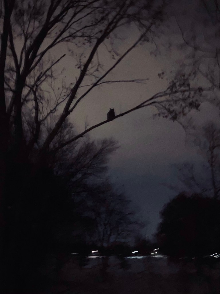 4:58am – I walked out my door with a hot burrito in my pocket and steaming tea in my mug. In the black of night I stopped to gawk at a great horned owl looking like a fluffy kitty in a tree. Then it took off, and I could see every fantasy legend creature inspired by the unfolding of those wings.