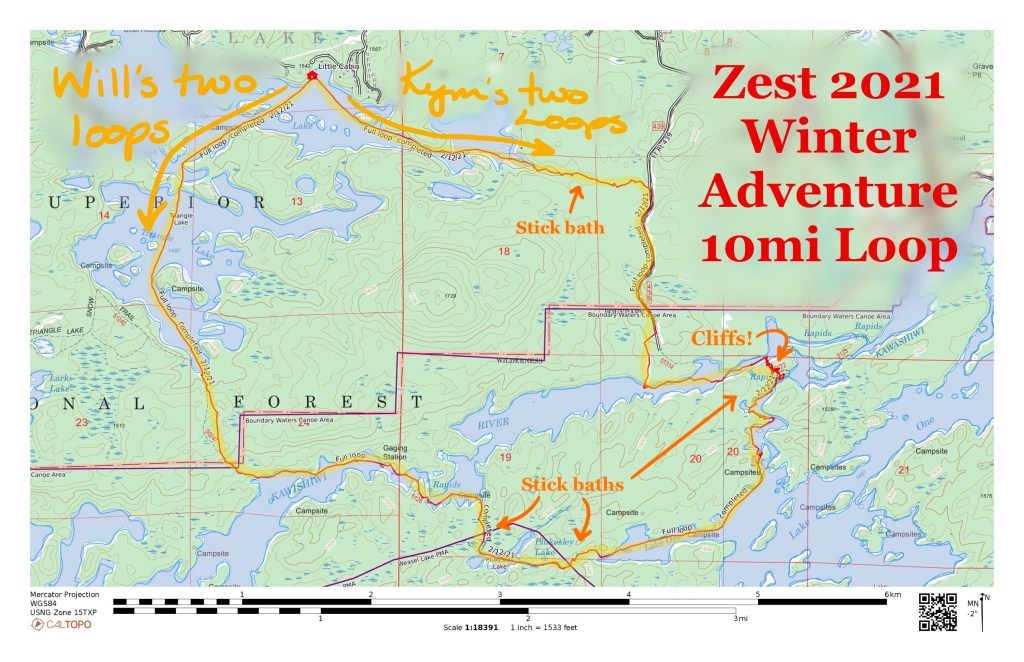 Not long after we found our track from the other day. After battling ungodly cold temperatures, open water, forests that wanted to eat us, and two cliffs, we had successfully closed our loop!