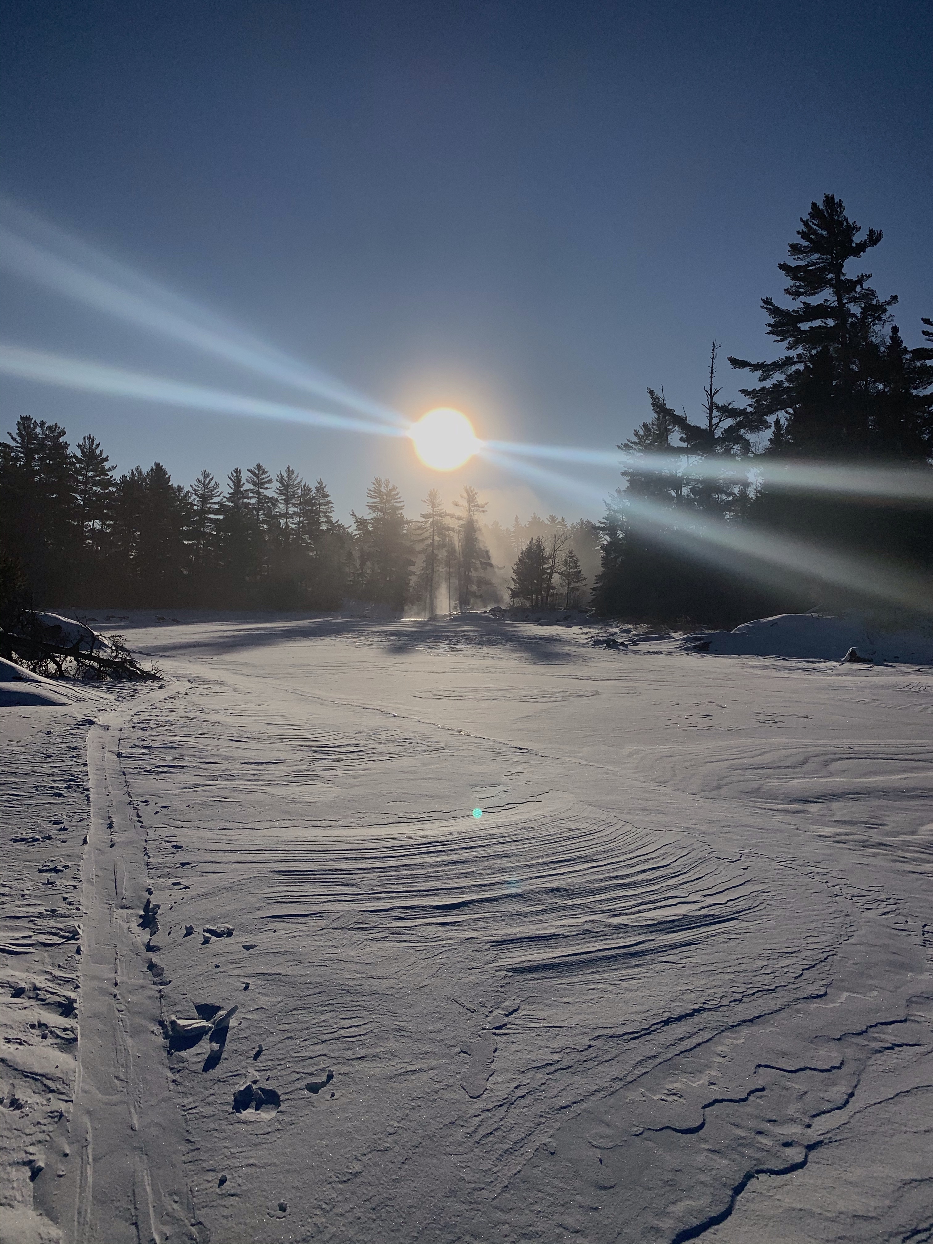 Alone, I skied towards a cantaloupe horizon. On the expanse of blue lake snow, I was joined by fresh wolf prints leading me towards the forest. In the dark woods, the sky brightened to a golden whiteness. As I advanced to the high grasses and spindly tamarack of the marsh, the sun stretched high enough to reach my breath frosted googles. I got a fairy disco filter on this otherworldly cold morning.
