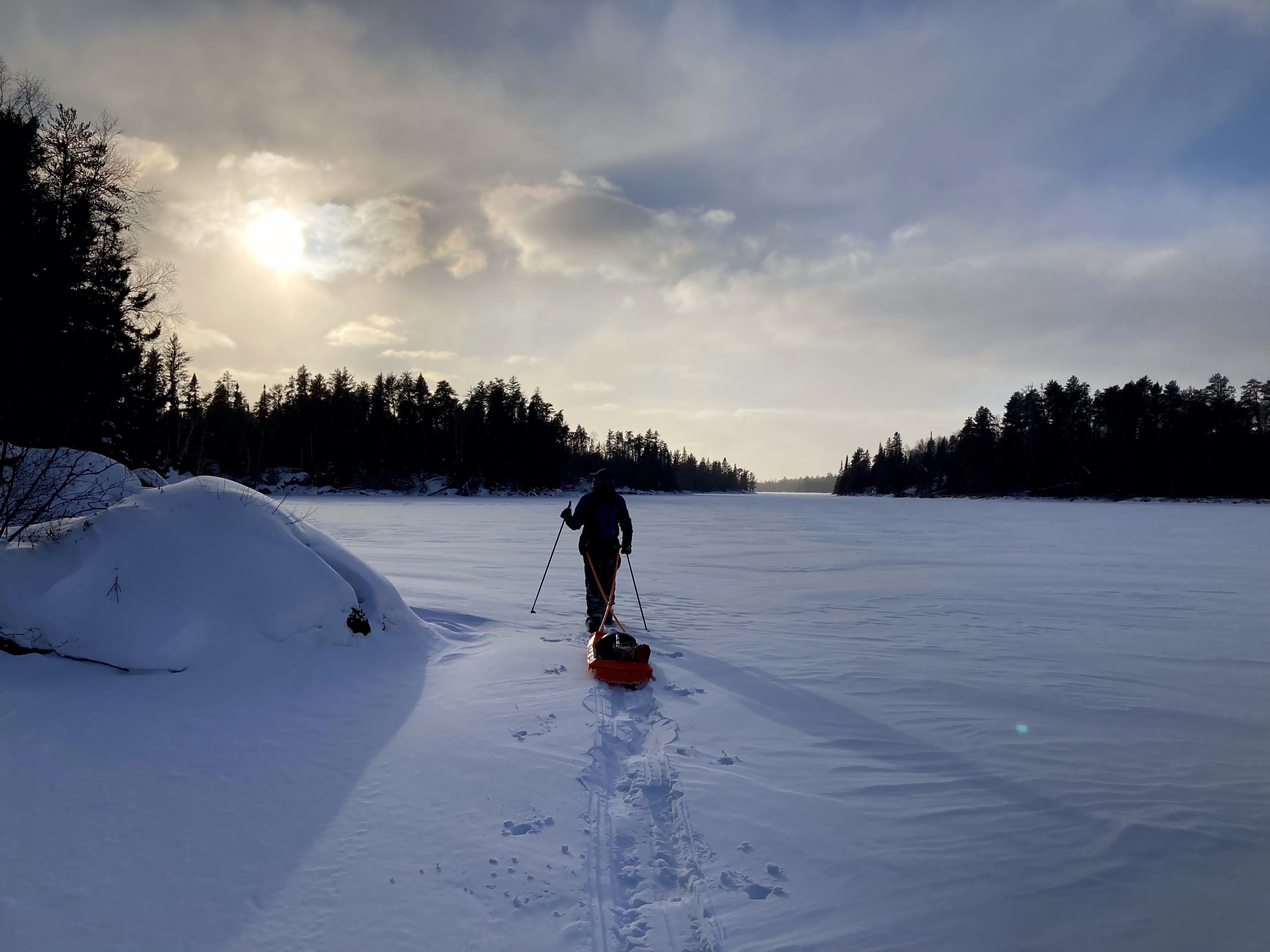 Became our rallying cry to ward off wild frustrations in bushwhacking. Because we didn’t sleep outside this year, we didn’t need to pull two heavily loaded pulks (aka sleds). Because we didn’t need to travel with so much stuff and we could travel until dusk. We could explore and create a special route just for us. It meant forging our own path through forest and swamp that would not normally be navigable in the summer.